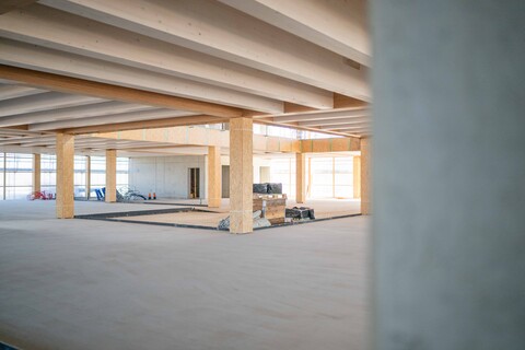 Cradle-to-Cradle gedacht, aus Holz gebaut und mit einer Fassade aus 60 % Recyclingglas – nachhaltig von Anfang an.